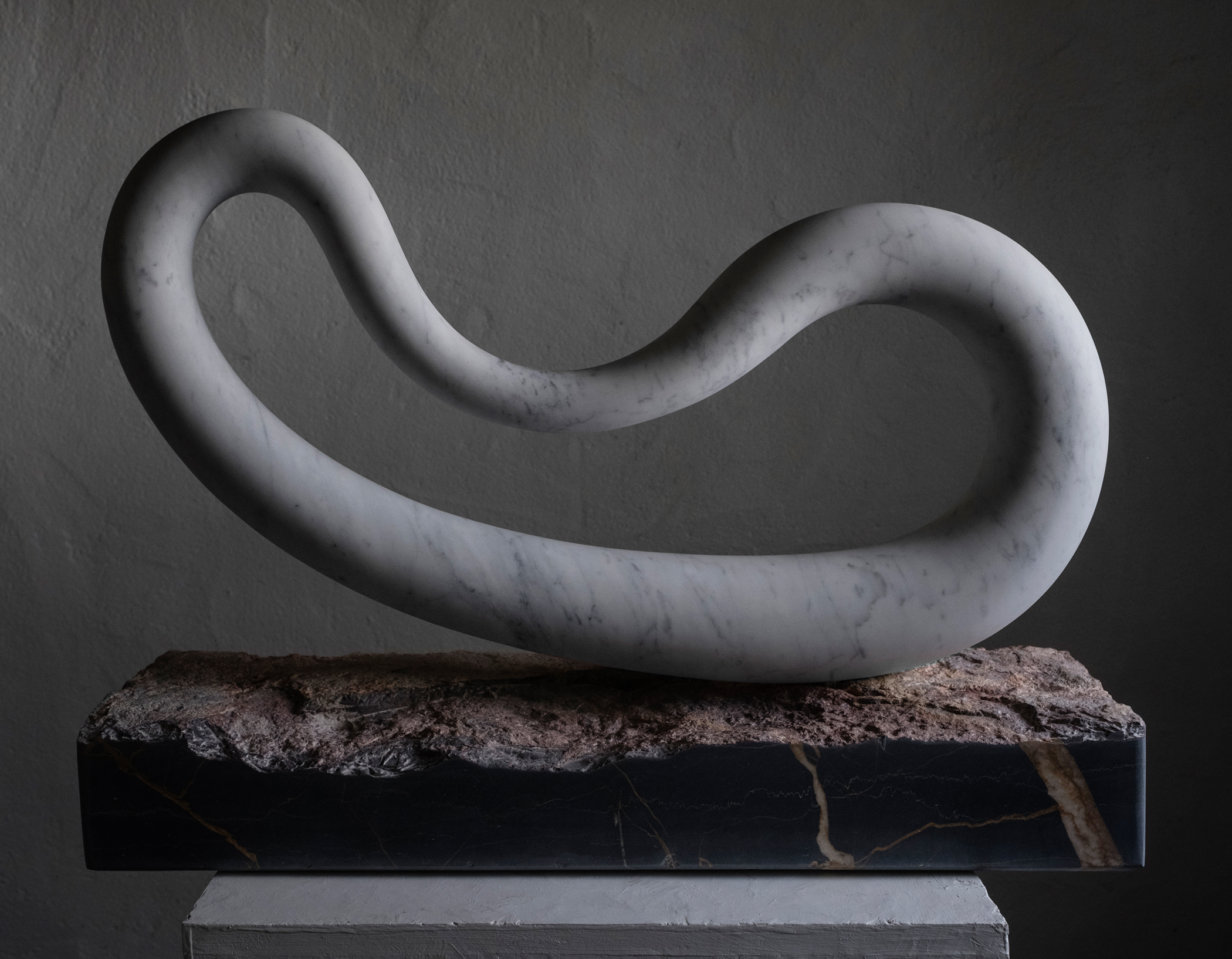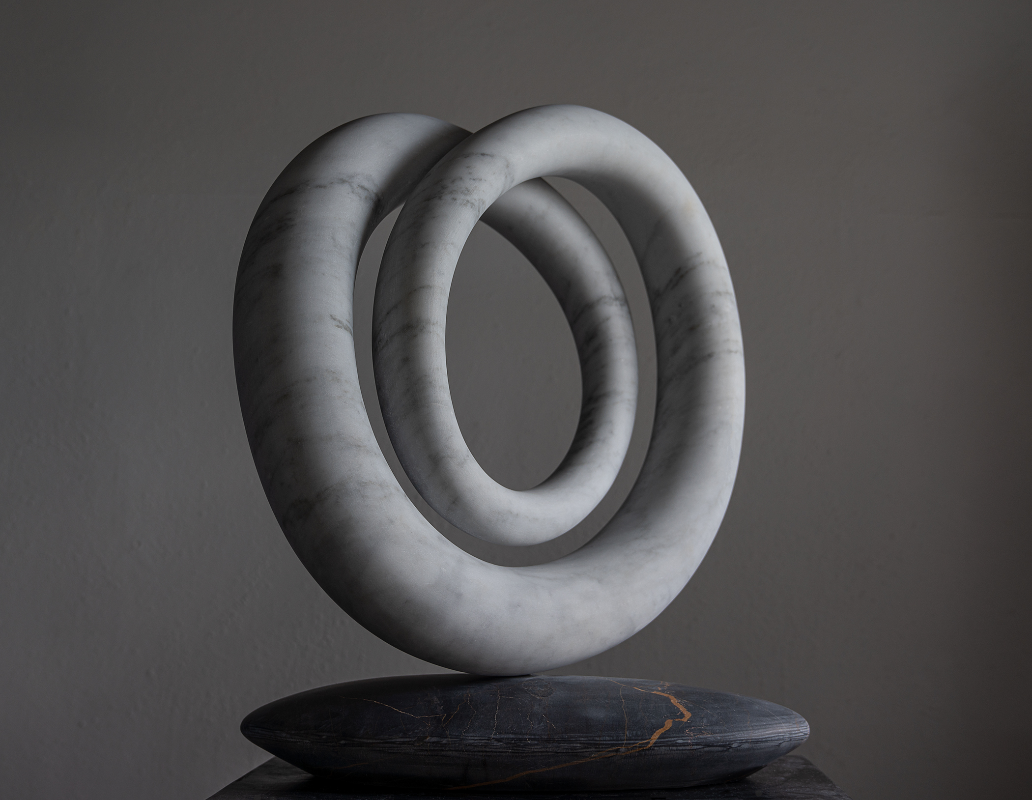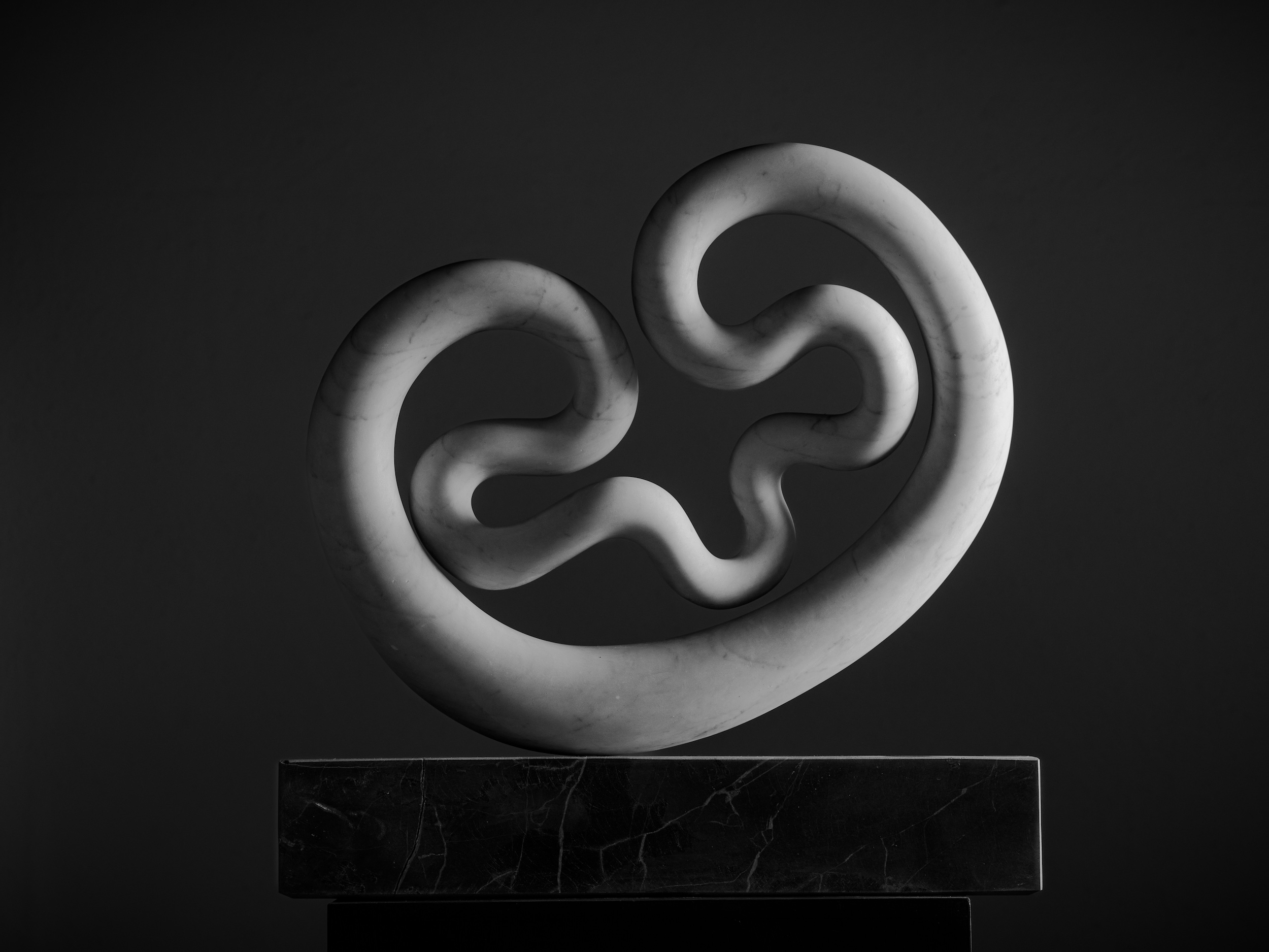 A more two-dimensional take on a continuous loop form. The form on turning inwards twists and contorts in a limited space before finding its way out again.